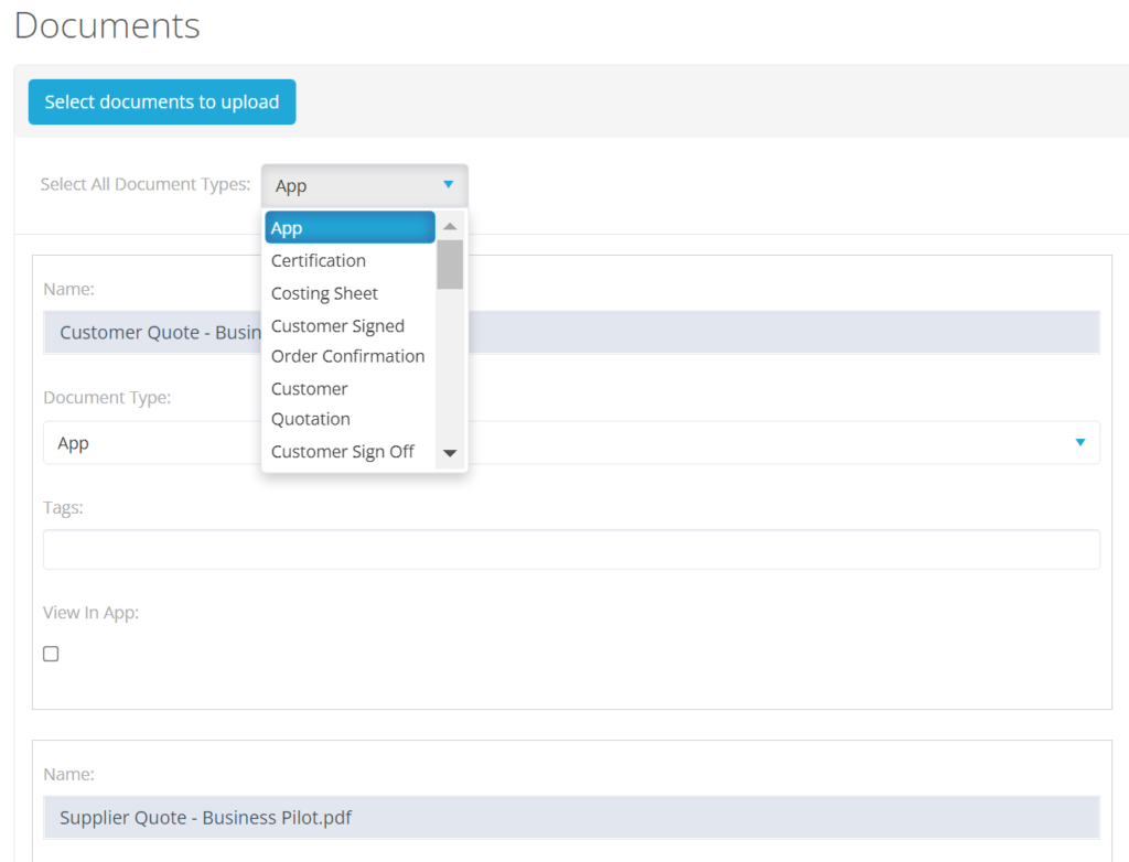 This is also available when adding multiple Documents; the list depends on what you have saved in the Admin menu, under Manage Document Types.
