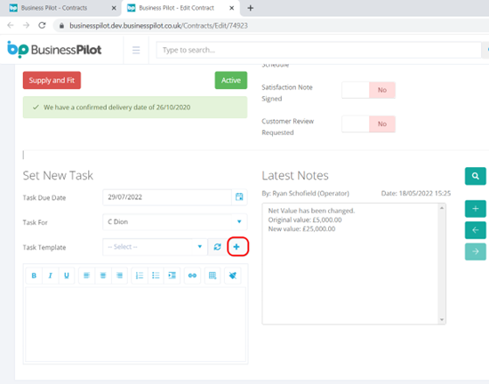 Now when adding a task, should you need to add a new template you can simply click on the “+” to the right of the task box to add this from the task page rather than via the Manage area. Please note, this is still an ‘Admin’ level feature so should you not have the required role this link will provide an error message.