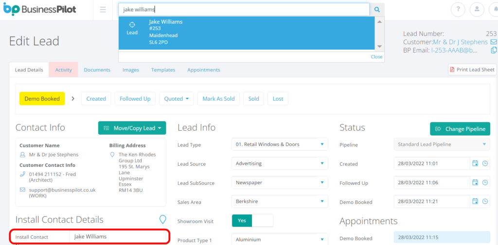You have the install contact name, number, and email within the Lead page. We have made the Install contact name searchable within the search bar at the top of the page. Perfect addition to the Install Address Ref, where you can place your customer’s reference too (again, searchable).