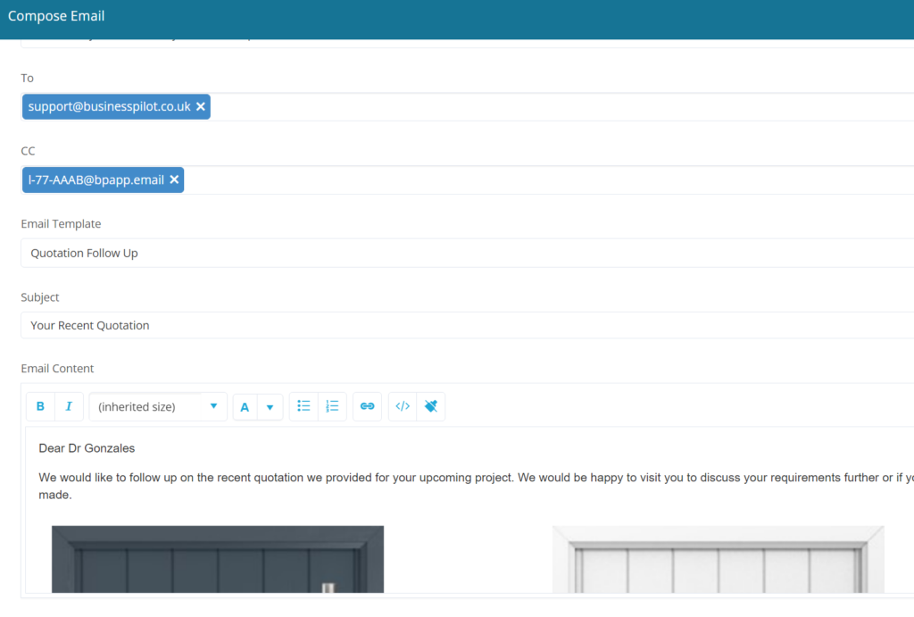 Now if you would like to embed a screenshot into an email this will pull through to the sent copy, and have an record displayed in the Activity tab, please note these screenshots cannot be directly saved to Business Pilot Documents and Images.