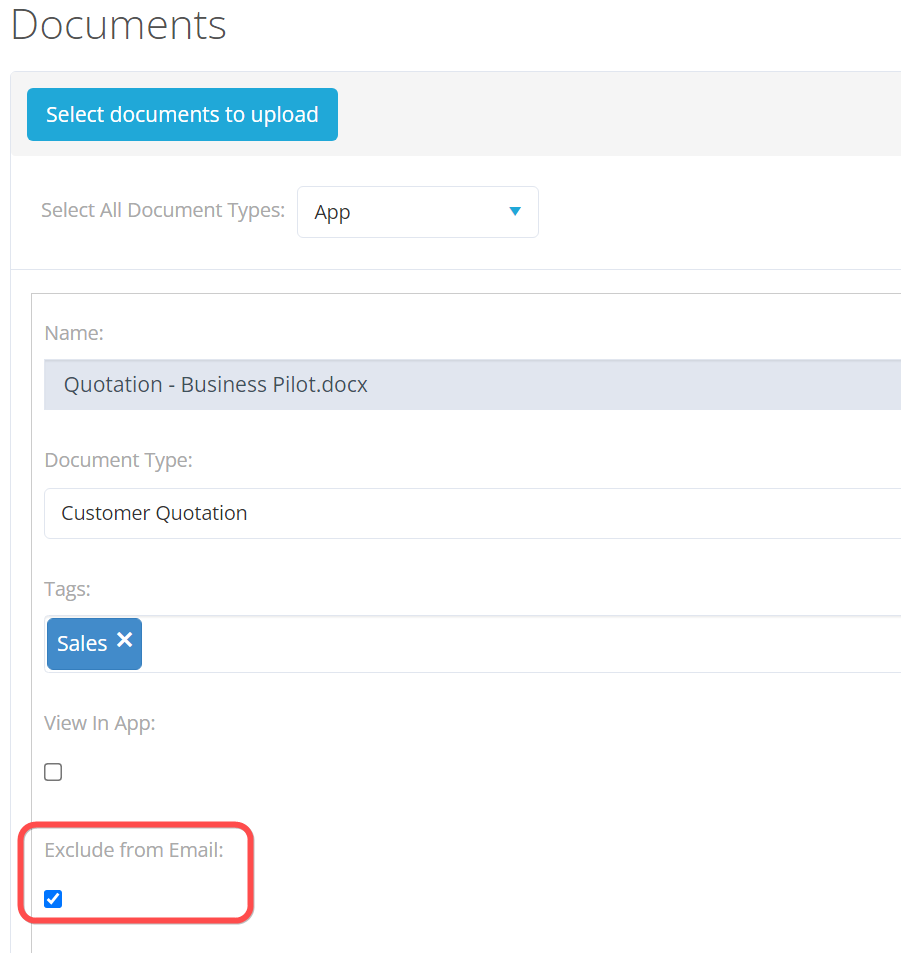 We’ve added a new tick box to enable you to exclude certain documents, saved in the customer record, from being emailed out of BP.