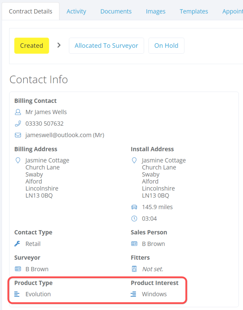We’ve brought through the Product Type and Product Interest into the Contact details within the Contract page for easier viewing, great to see while booking in appointments and the installation.