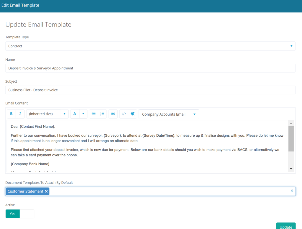 We have enabled document templates to attach by default to email templates, so you can select certain document templates to send alongside emails. This is an Admin level feature, please visit the Admin menu if available in your account and head to manage email templates to include this feature into your system.