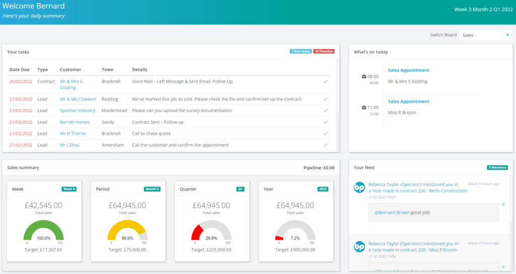 Below this, you will find your Sales Summary, here you will be able to see your performance against target for the current week, period, quarter and year as well as the current value of your Pipeline at any time. This is a snapshot view of what ‘Admin’ roles can be seen in our extensive reporting & MI areas. To the right, you will find your feed which includes any notifications and mentions in notes.