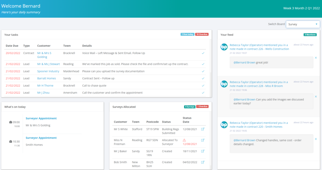 With our Survey Dashboard, in addition to the ‘tasks’ and ‘your feed’ your Appointments for the day will show in the bottom left-hand side corner. You will also have a section where you will be able to see the status of the Surveys Allocated (which is driven by the Contract Owner) and the last status date so you can check everything is moving along nicely. Setting KPI flags in your pipelines will help you see which contracts have stayed stagnant for more time than desired and will show as ‘Overdue’.