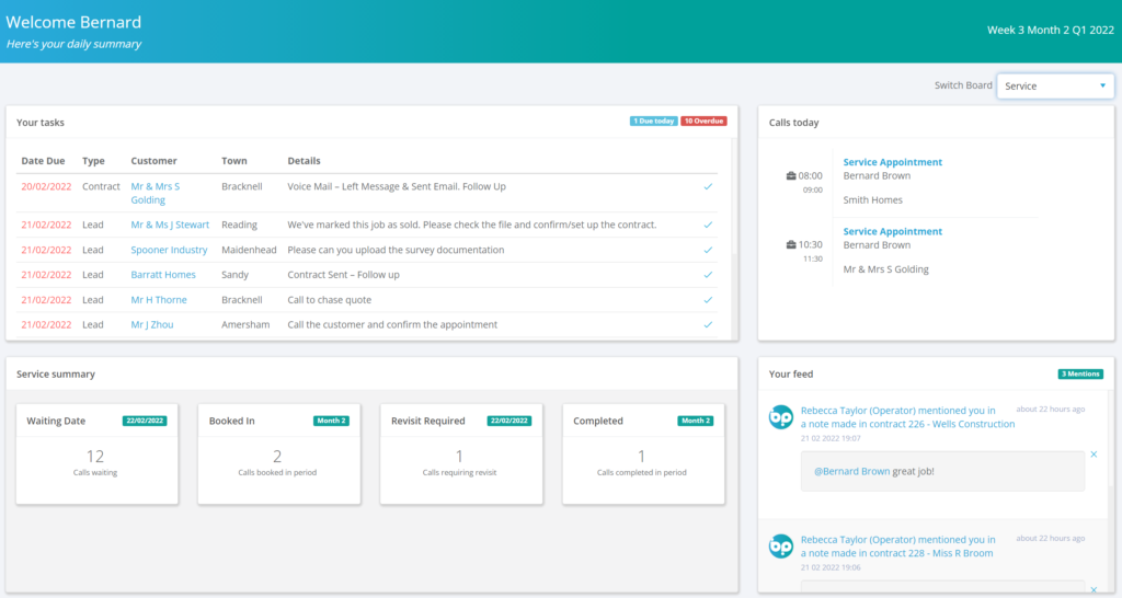 Below this, you will find your Service Summary, here you will be able to see how many calls are waiting to be scheduled, those booked in throughout the current period, how many revisits are scheduled and how many service calls have been completed across the current period (quarter), To the right, you will find your feed which includes any notifications and mentions in notes.