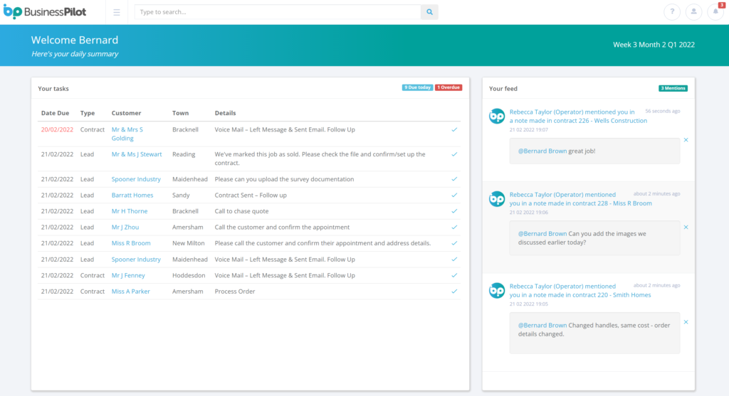 Here you will find tasks on the left-hand side and your feed for the day on the right which includes any notifications and chat mentions in Notes. The tasks have merged together into one focus screen, they are no longer split between Contact, Lead & Contract but you will still see this label in the ‘Type’ Column. We’ve also now included the details of the task to help you see what you have to do right away without needing to visit the page. The ‘Customer’ name in blue is linked to the relevant Contact, Lead or Contract it relates to for easy access to the right area.
