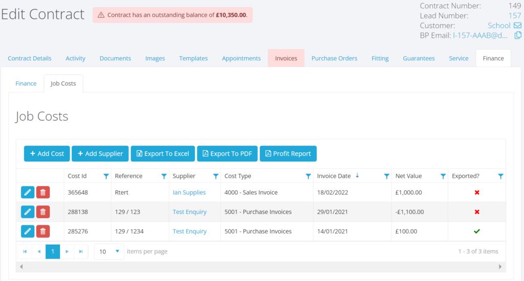 Within the contract page, under the finance tab, where your job costs are kept safe and protected in the Finance tab, under ‘Job Costs’, you will find a new Job Profit report. This report is to show items, contract value and profitability and margin.