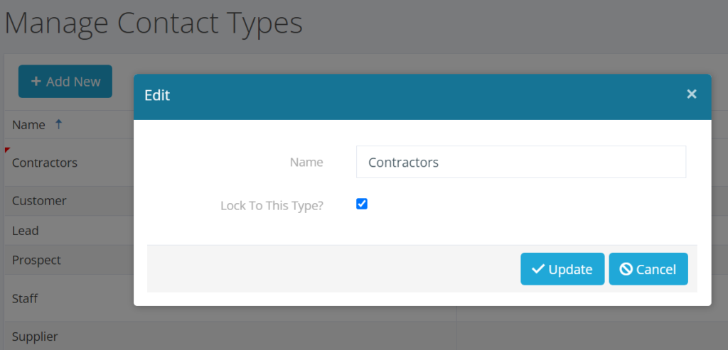 If you have added further Contact Types such as Architect, Contractor, Developer, Sales Rep, etc., you can now visit Manage Contact Types in the Admin menu and Lock Contact Types. This means when a Lead or Contract has been raised against the contact, this will not move to the new type but remain as the original selection for better tracking and management of sources.