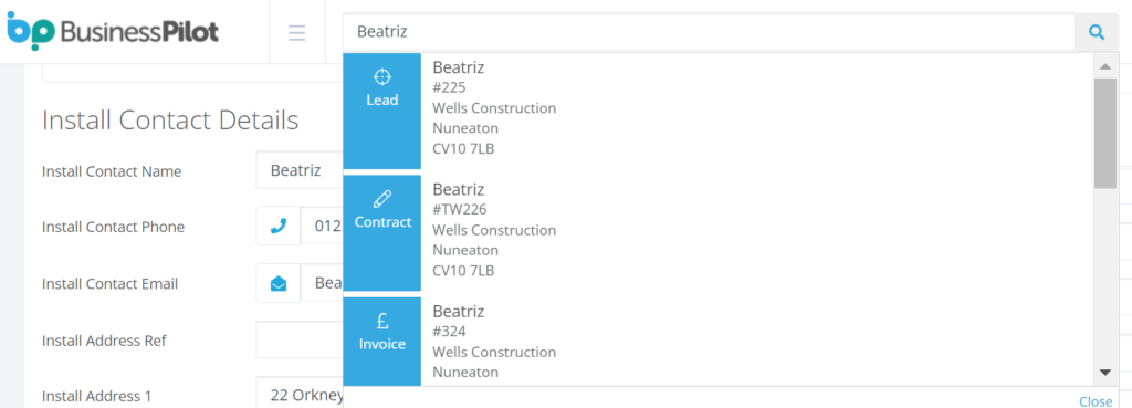 Install contact name used for search via the main bar and included on Lead, Contract and Service grids too.