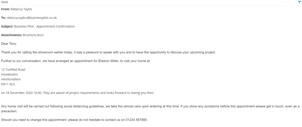 Attachment Record: Sending an email though Business Pilot saves a copy of this within the customer page within the notes section, we have included file names of the attachments into this note so you can see exactly which documents were included.