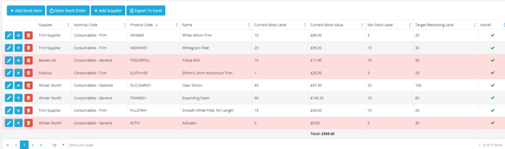 The current stock level will highlight red if your current stock level drops below your ideal minimum level, as it does if you set KPI flags in Status Progression. Again, an excellent visual guide to see which items are running low and may need an order sooner rather than later.