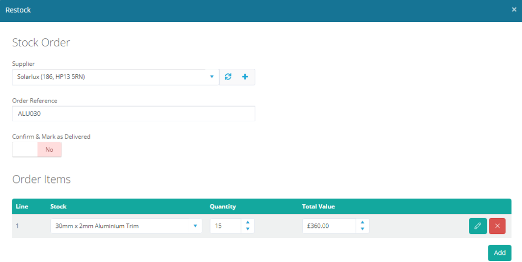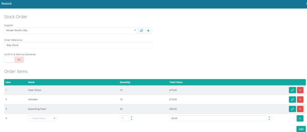 Alternatively, you can also add Stock Orders in the Manage Stock Orders area, where there is another +Add Stock Order icon. In this area, you will also see any raised stock orders where you can view those delivered and those awaiting delivery. There’s a tick icon where you can mark these orders as received.