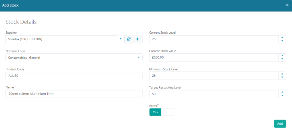 In the pop-up window, you can add the Stock Details via the relevant Supplier. You can allocate an appropriate Nominal Code for accurate reporting as well as a Product Code & Name. In addition, you can set Current Stock levels, Stock Value, Minimum Stock levels & Target Restocking levels. These will be used within the Notifications later on if you run low on any stock items.