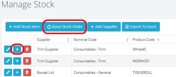 To raise an order or add more stock you can click the plus icon directly adjacent to the stock item, which will open a prepopulated form with the supplier and stock already preset.
