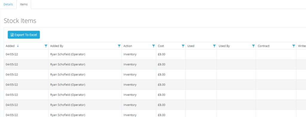 Inside Manage Stock, if you click the edit icon, you’ll have two tabs, one for details and another for items. Within the items, you’ll be able to see, in order, the items that have been allocated. You also have a write-off option if the product has become defunct, damaged, or even lost. When assigning these items to a contract, a job cost will be raised automatically.