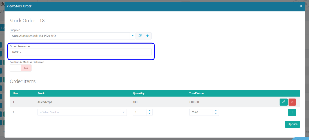 The ‘”‘Order Reference’ is now able to be amended once you have added a ‘Stock Order’. This is useful if you don’t always have an order reference upon ordering stock and want to add this at a later date.