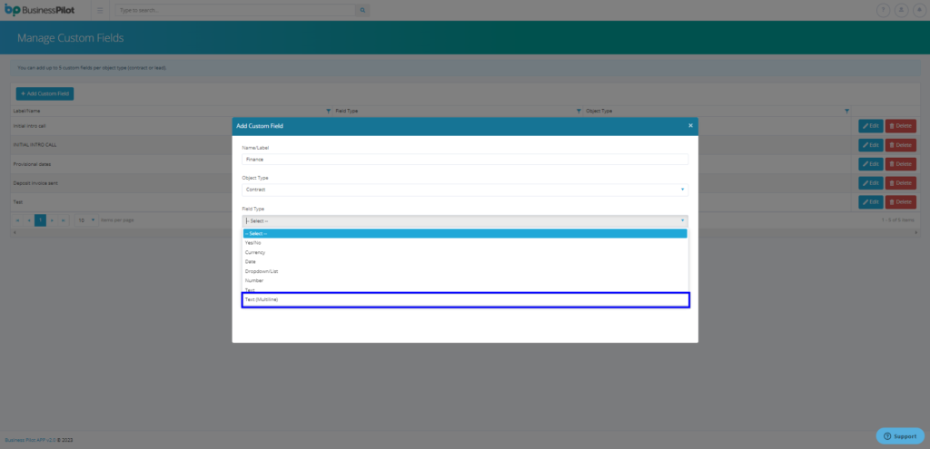 Back in September we released “Custom Fields” into Business Pilot. We have now added an additional ‘Field Type’ called ‘Text – Multiline’. This will give a larger text area to enter your custom information into. This is available in both Leads and Contracts.