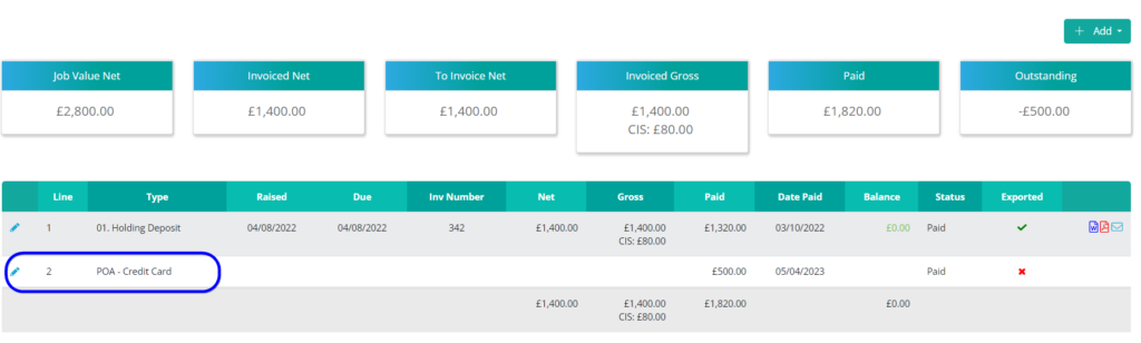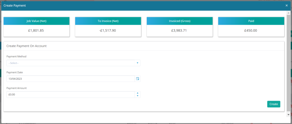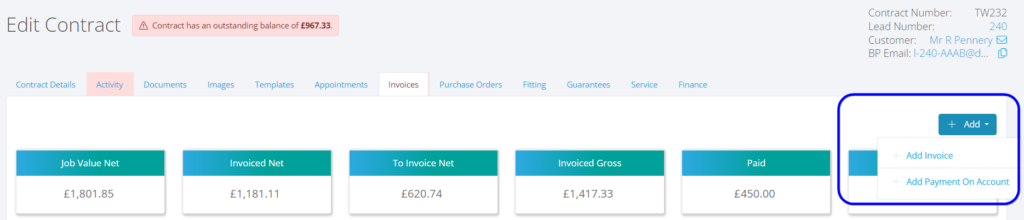 We have added a brand new ‘Payment On Account’ option within the invoice area. This means you can now add a payment to a customer contract prior to raising an invoice. The payment will show in the paid column and bring down the resulting balances and orders on hand.