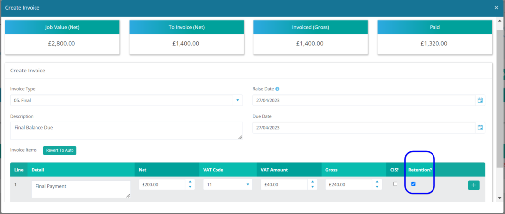 For commercial customers with Retention payment terms you will now be able to set this as an additional line within individual invoices. It will work like the CIS with a tick box and will create a minus line within the invoice.