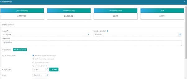 You create invoices in the same way that you normally do in Business Pilot. As an example, lets create a deposit invoice with today’s date as a raised date: