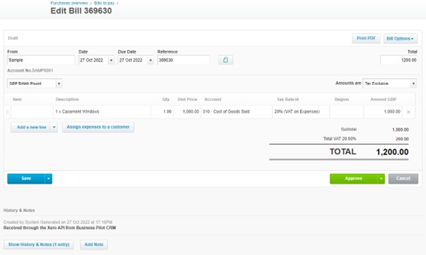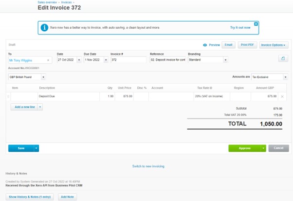In this example, we hadn’t matched up our nominal codes fully (as per the setup section above), but you see this isn’t a problem as the invoice still comes through and can be assigned to the correct account through Xero. We see that it’s also correctly picked up the VAT rate set in the contract. The invoice number is set to match the invoice number generated in BP to keep this consistent. If you are happy with this invoice, you can then click on Approve at which point it is posted to the customer account and correct ledgers in Xero. Xero also lets you know that for any invoice, where it was created from, and you can see in the notes section above that it was received through the API from Business Pilot.