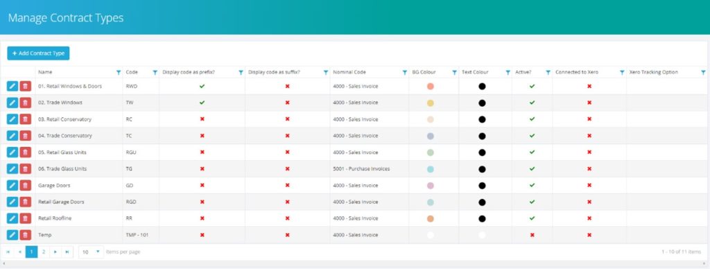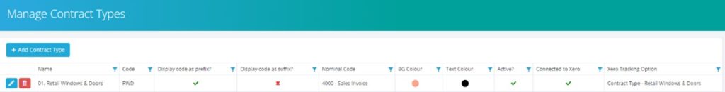If your system is now connected to Xero and you go to manage contract types you will see the following: