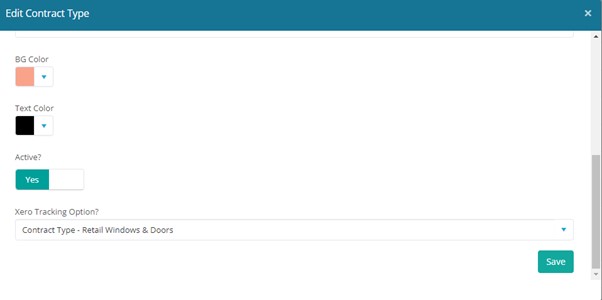 The Xero Tracking Option field shows a dropdown listing all Active options for all Xero categories. For example, we created a Contract Type Tracking Category in Xero and then under that a Retail Windows & Doors options. If we select this and save it the list of contract types refreshes and we can now see it is connected: